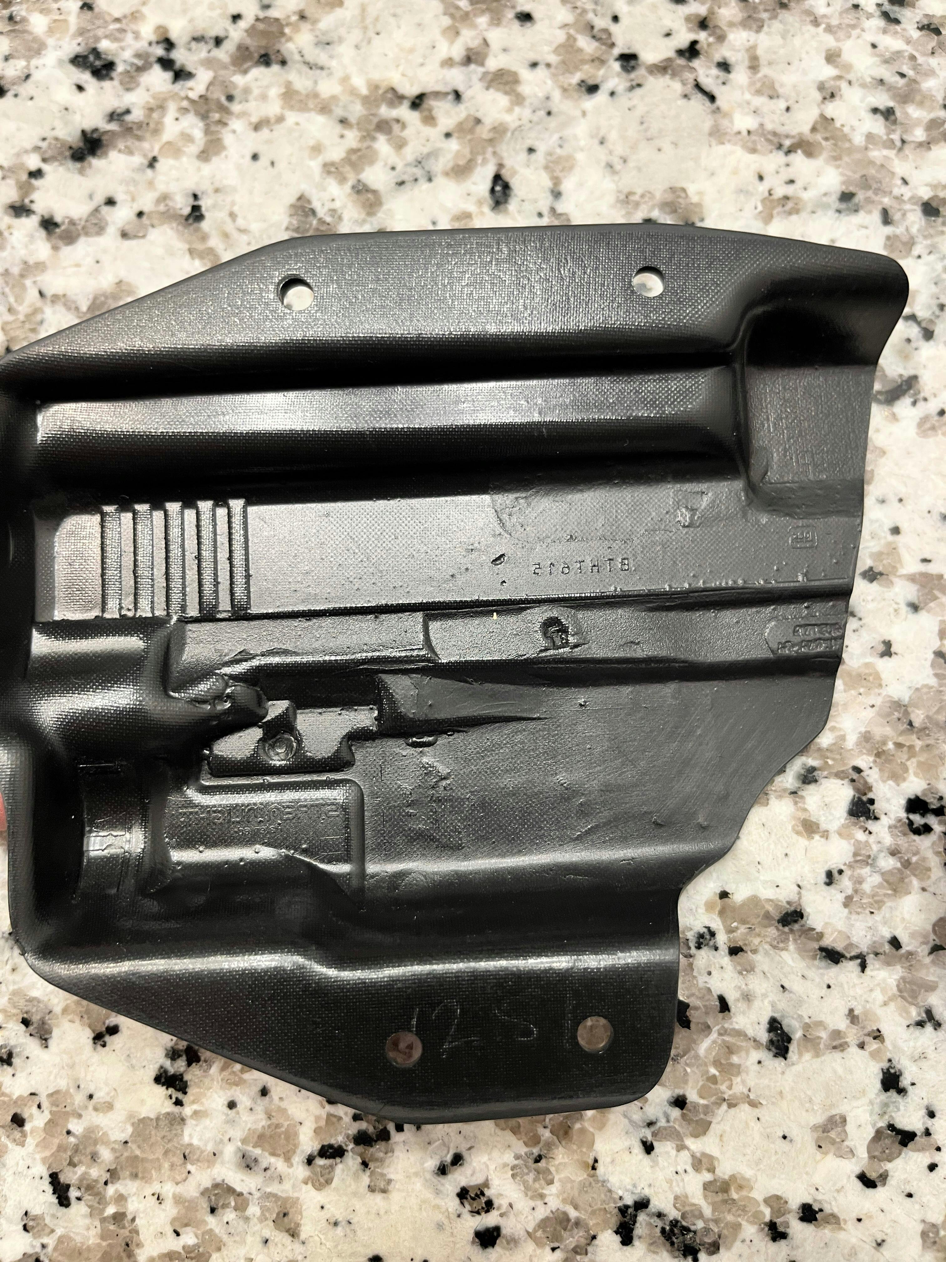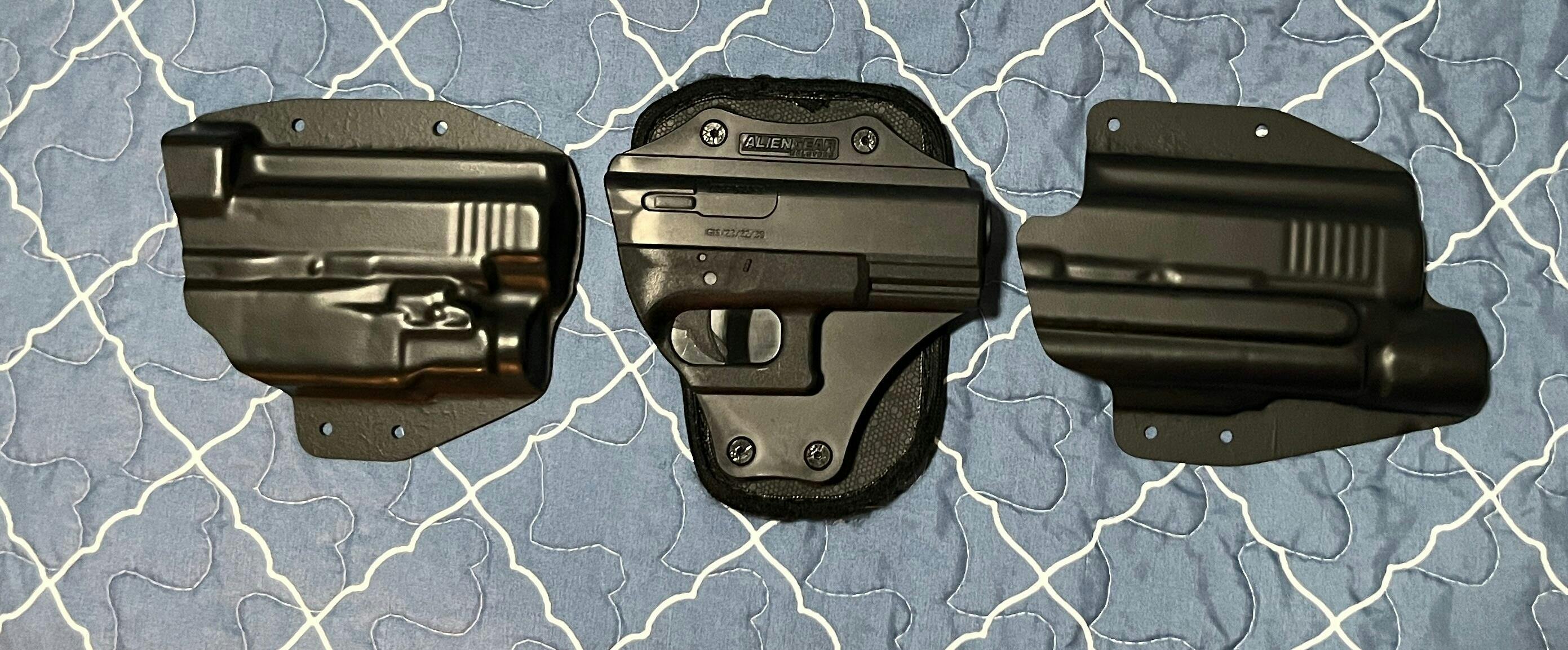 I purchased a hook and loop holster years ago for a base Glock 19 (center item in the picture) and a pancake holster too. They were both formed well with clean lines, had the brand embossed at the top, and , more importantly, the gun make that it went to was on there. I just order 2 shells to replace the old one since I have optics and lights now. What arrived was some basic quality lured that I would expect from a Chinese holster on Amazon. And to prove the point, you can see the serial number to the gun that they used to mold the shell on. The interior of the shell is riddled with bumps and boils from them using poor molding methods. Very dissatisfied and generally disappointed. This might not have been my first purchase from AlienGear, but it is definitely my last.
